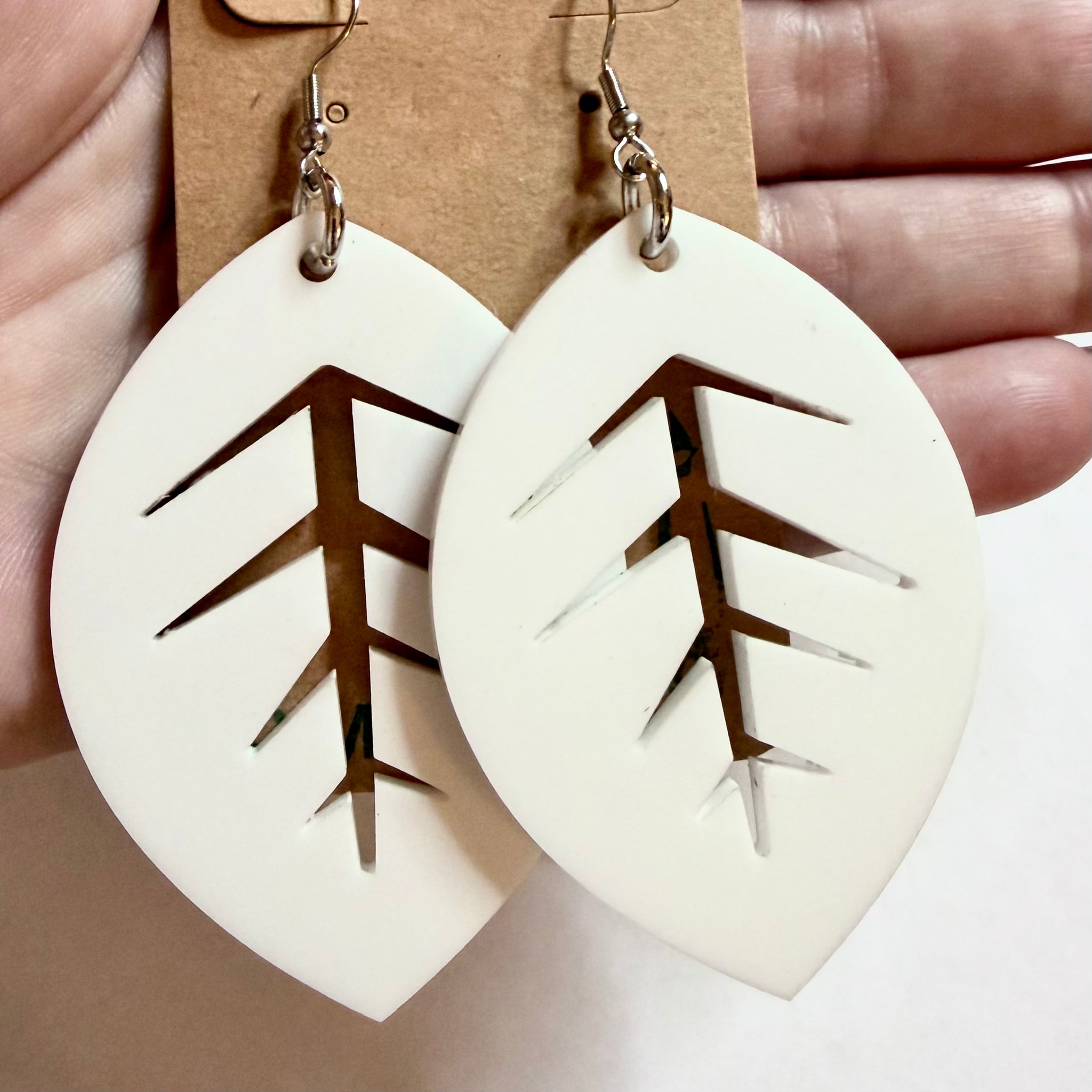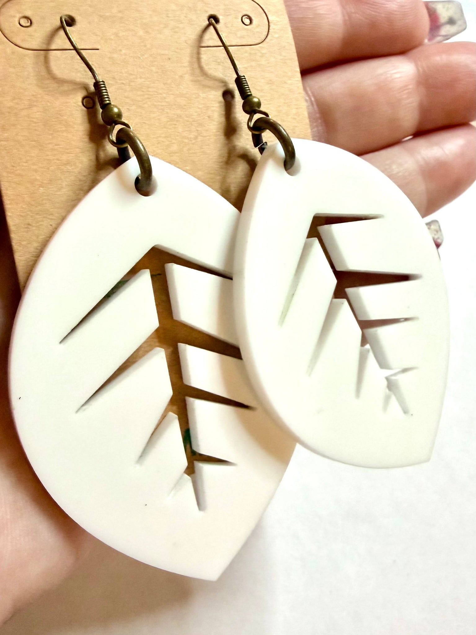 Lasercut acrylic white leaves available with either silver surgical steel hooks or antique bronze hooks.