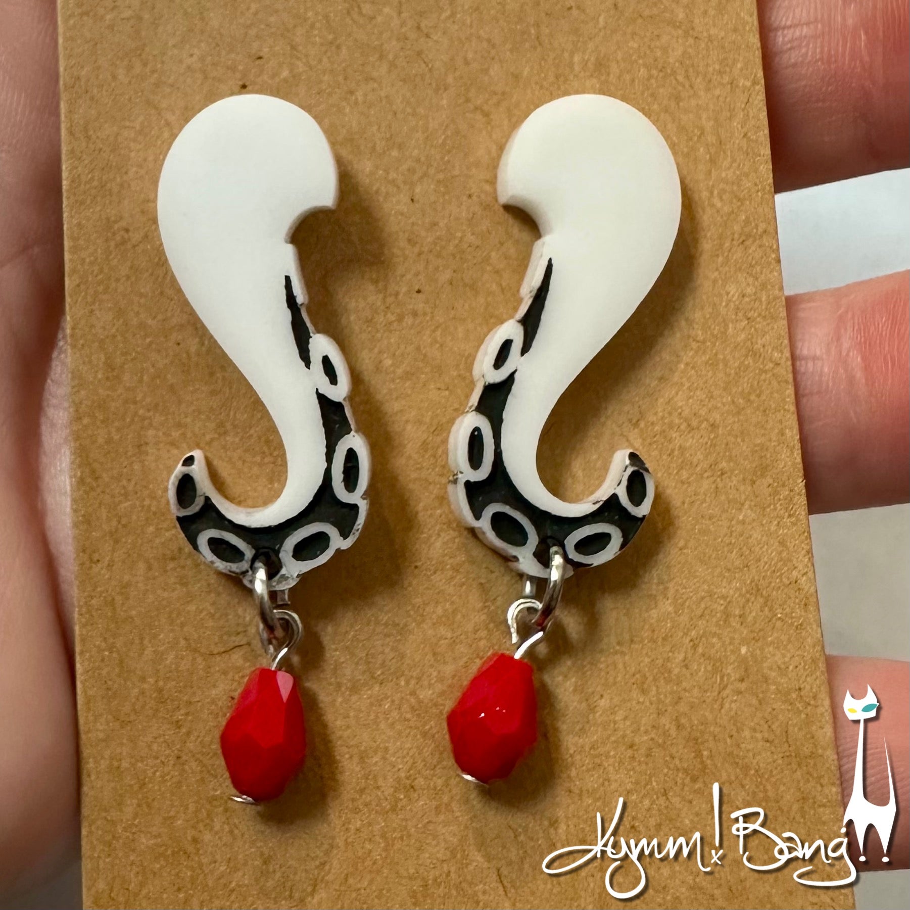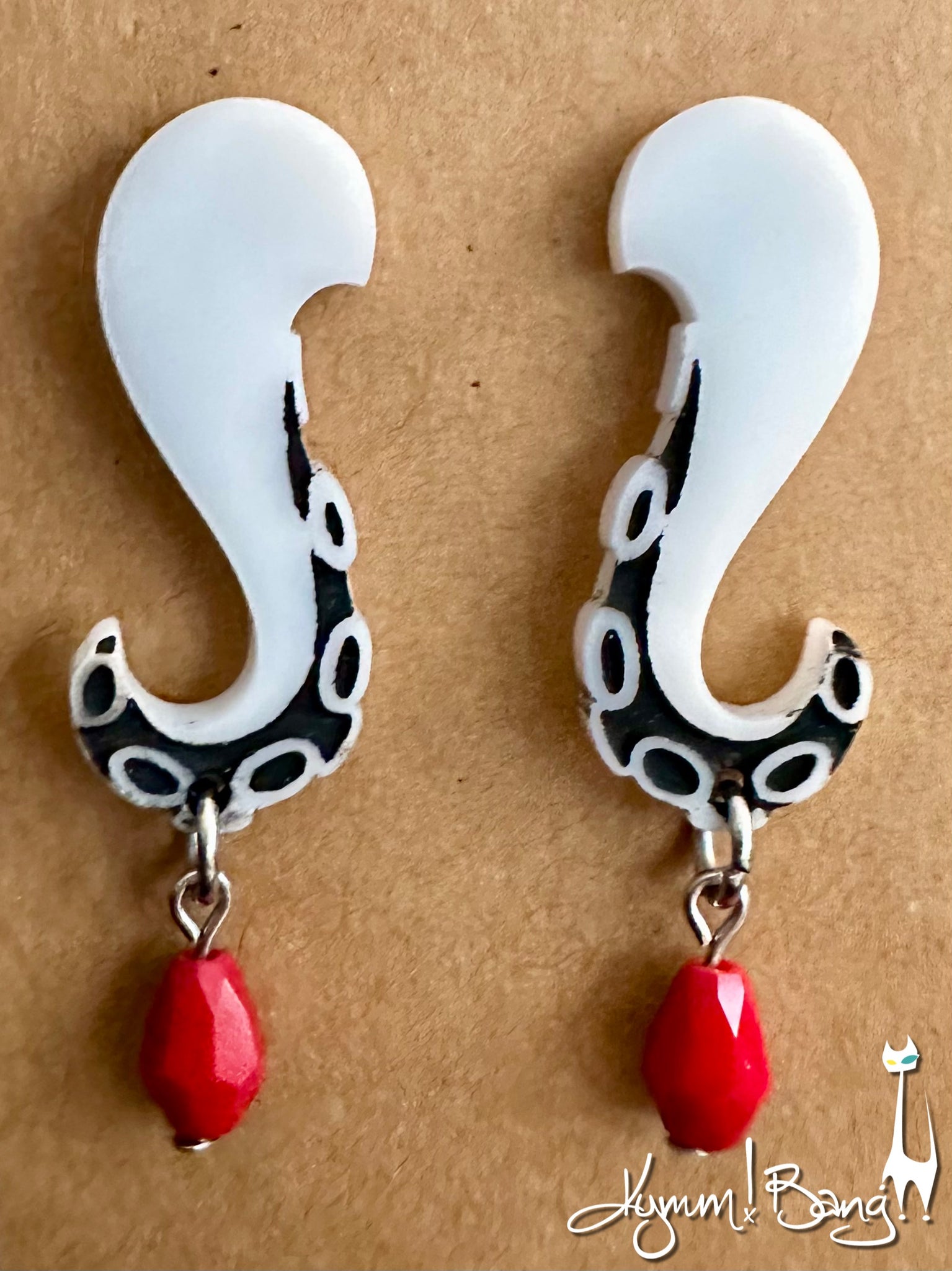 White tenticles with red bead drop. These are laser-cut acrylic pieces. 1 7/8” long from the top.