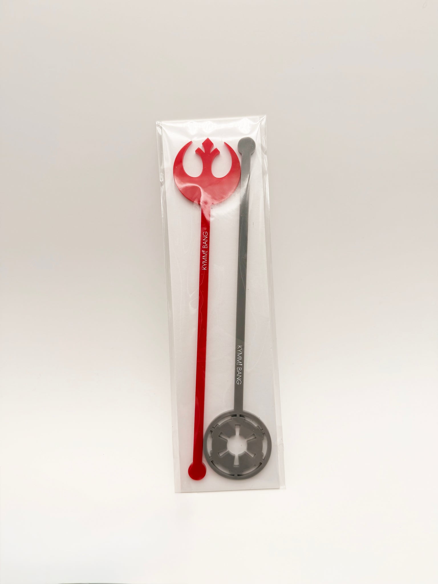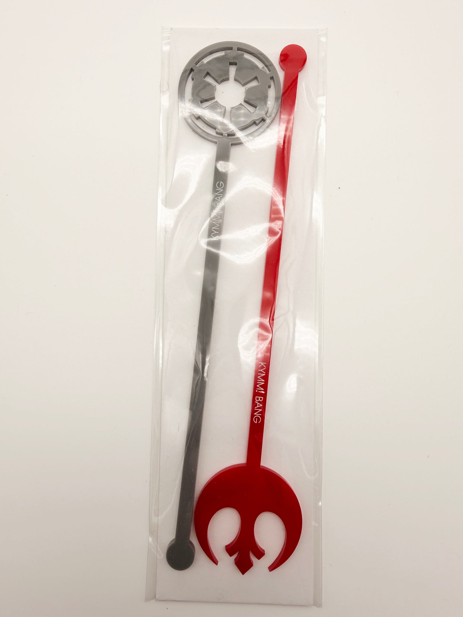 This Star Wars–inspired drink stir set features two bold, laser-cut acrylic drink stirrers showcasing iconic galactic symbols in striking red and sleek gray. Clean lines, crisp cuts, and a playful sci-fi edge make these perfect for stirring cocktails, mocktails, or blue milk—whether you’re hosting movie night or just adding a little fandom flair to your barware.
