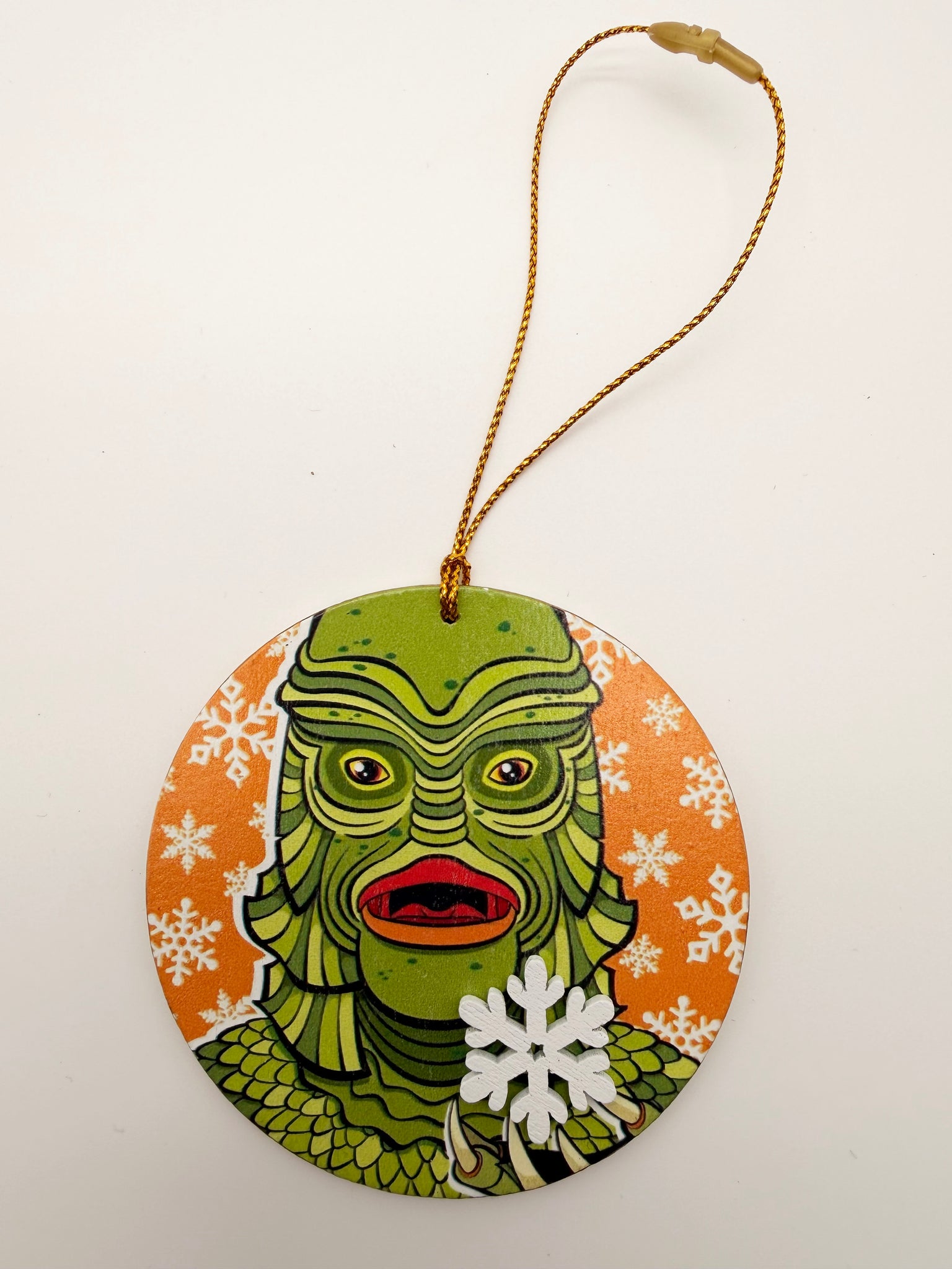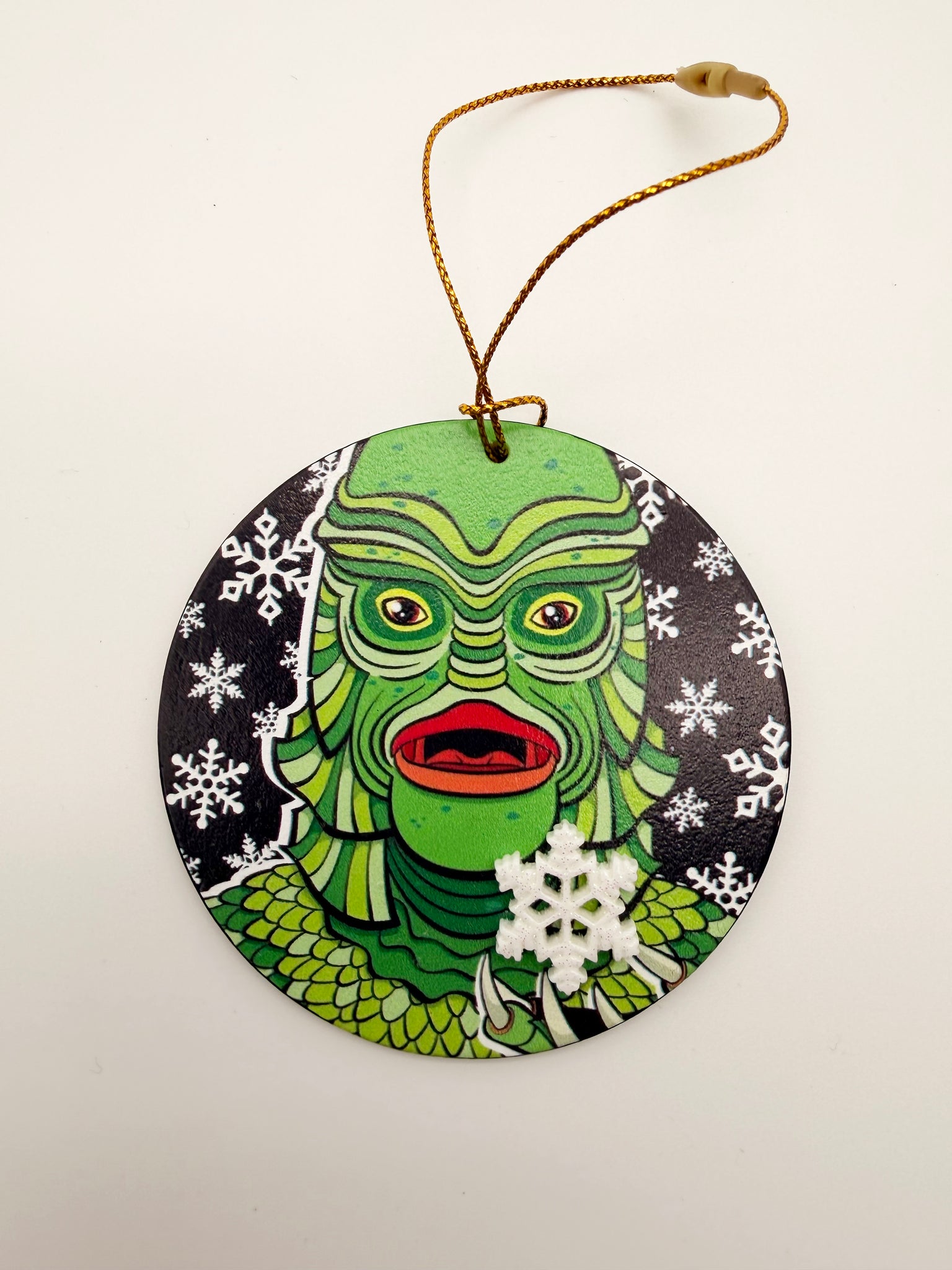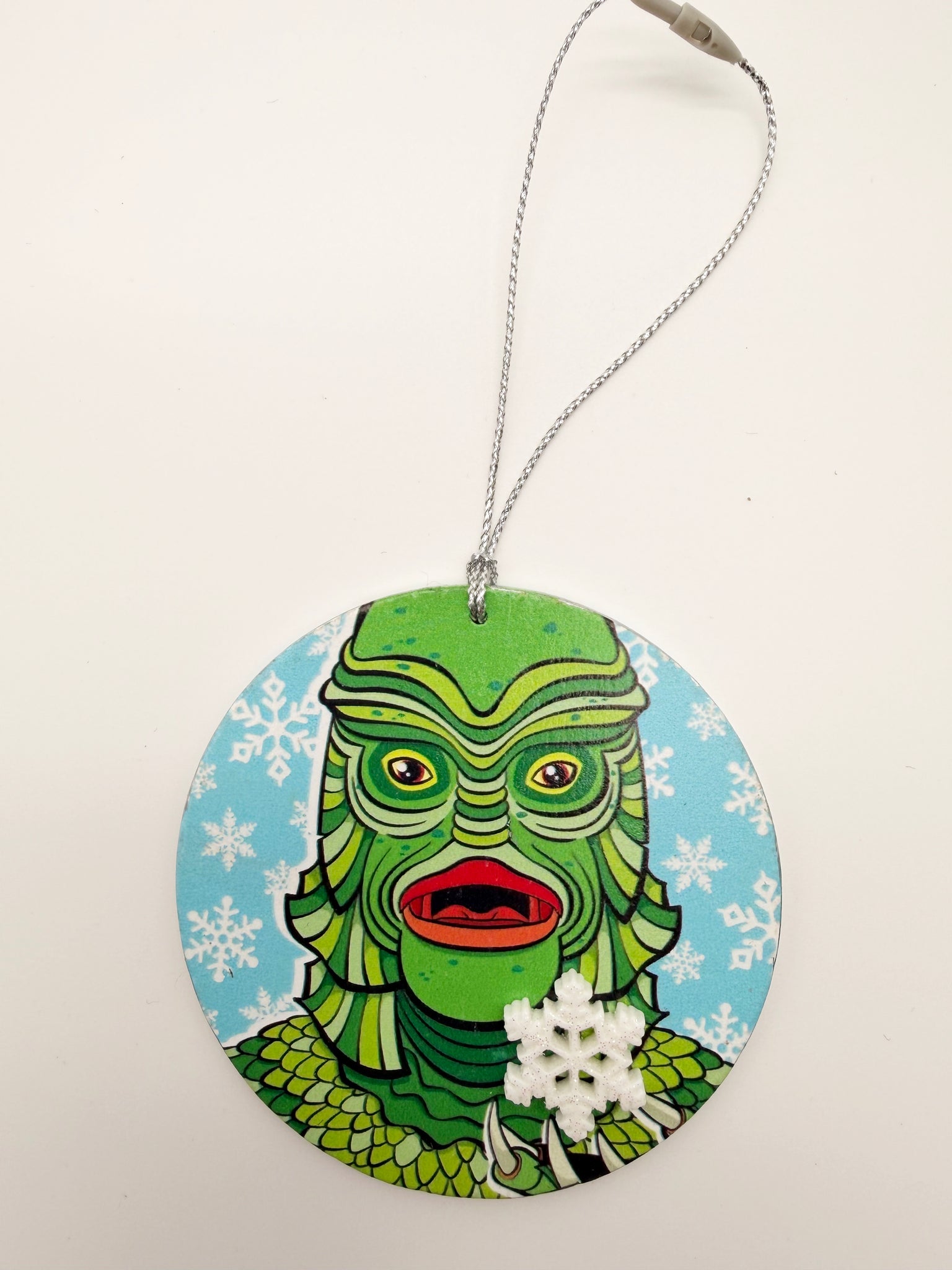 This Creature from the Black Lagoon ornament features a bold, retro-monster illustration UV printed on wood, complete with a charming snowflake embellishment—perfectly blending spooky nostalgia with holiday cheer.