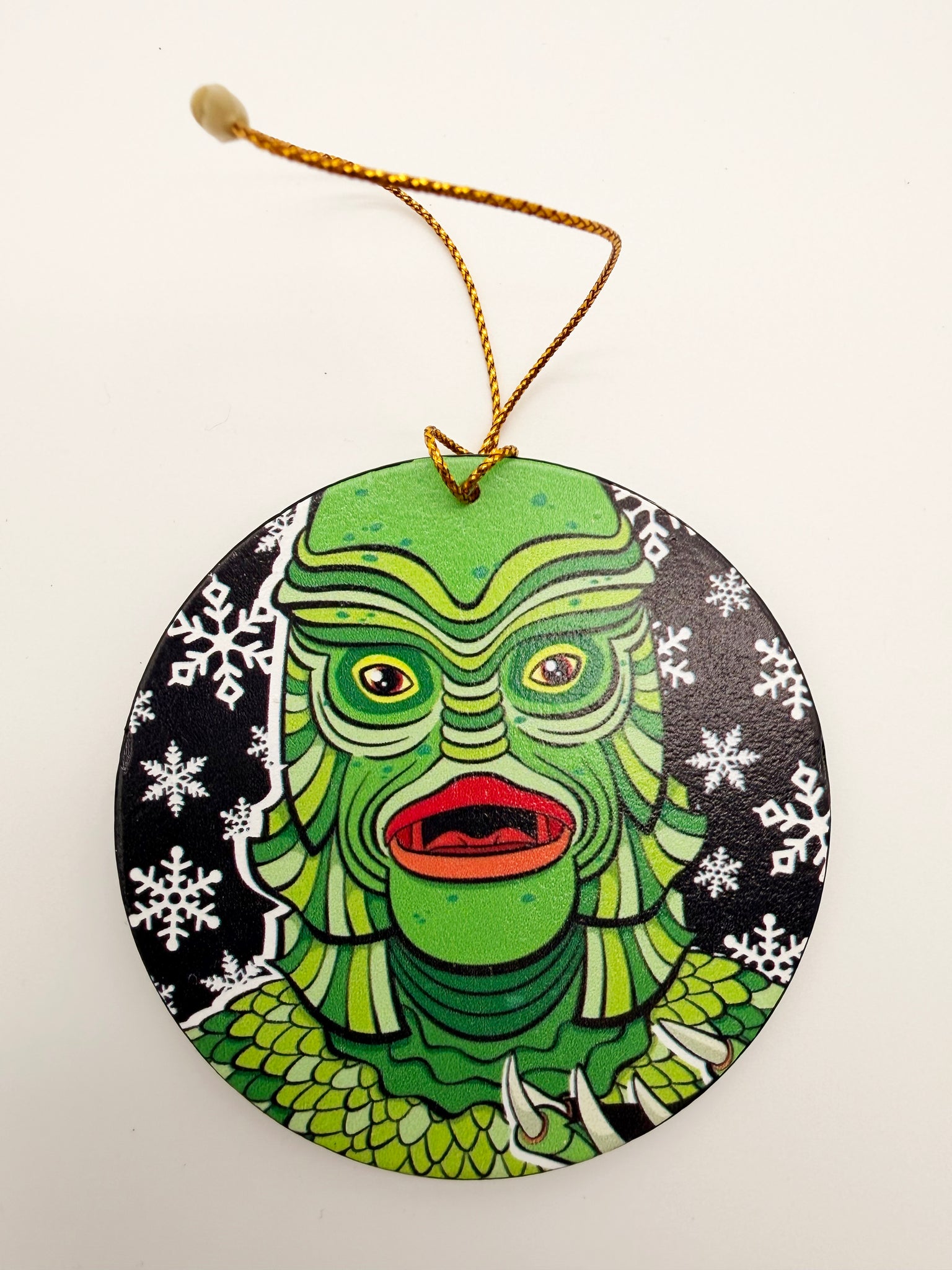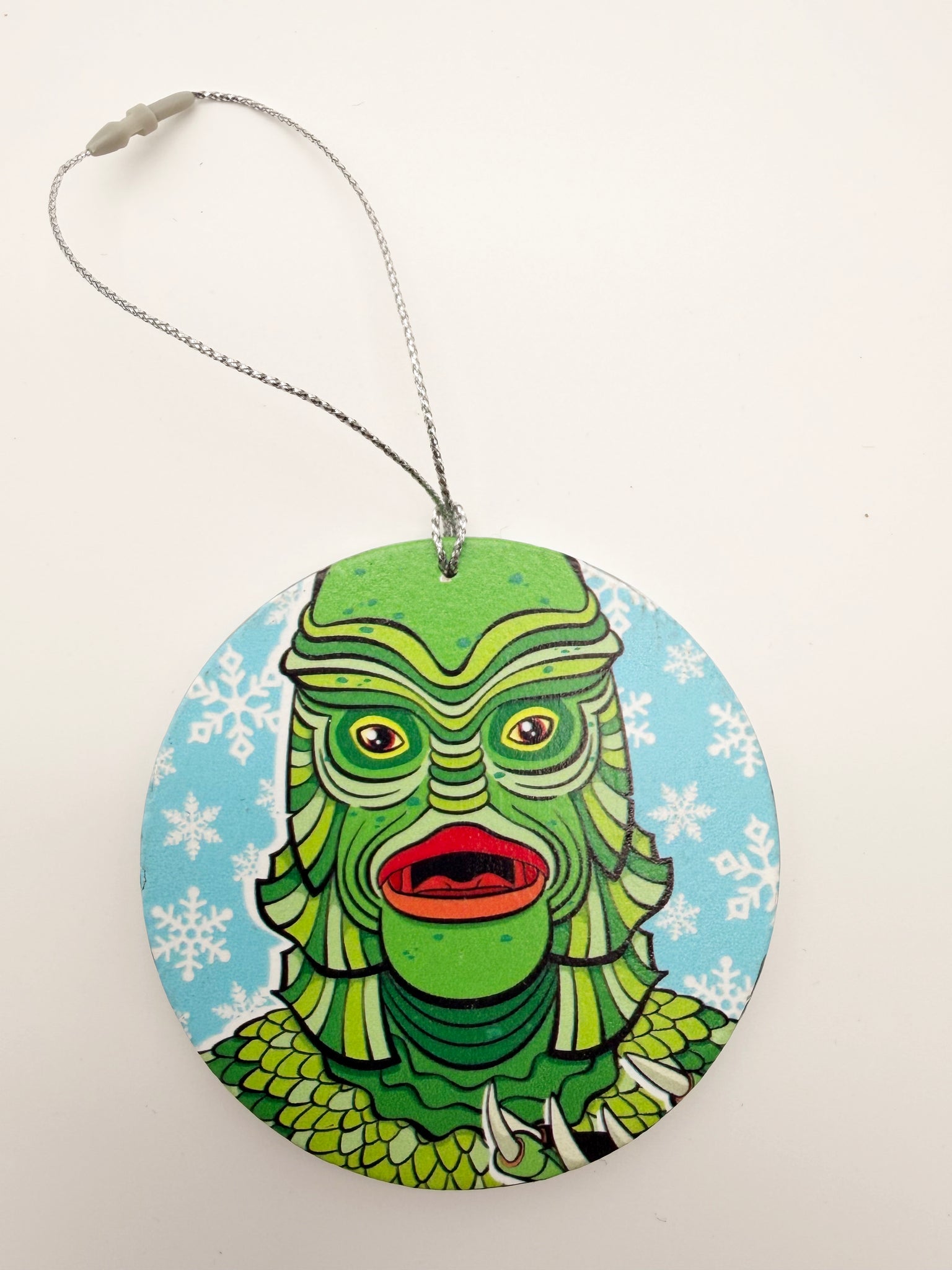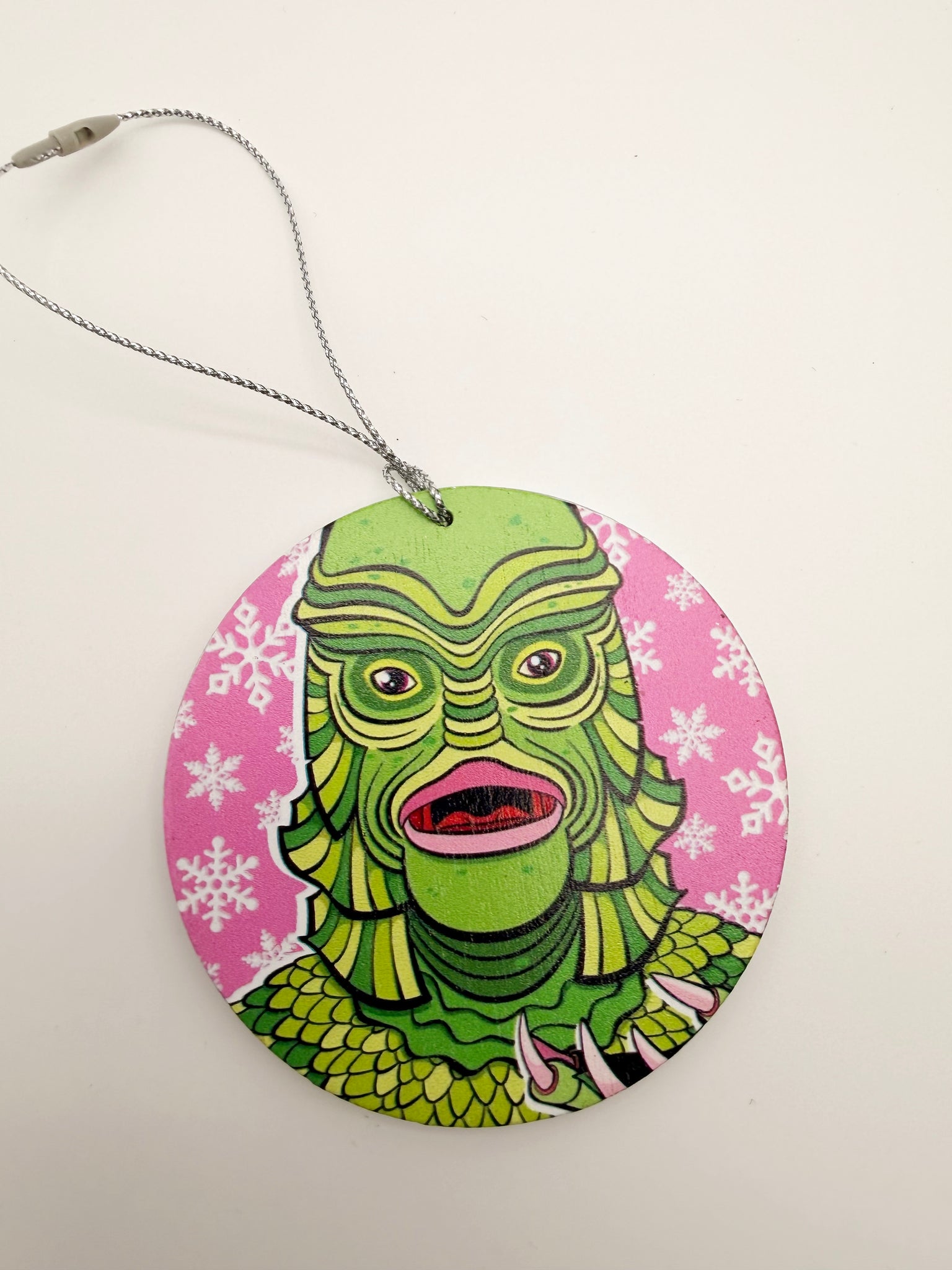 This Creature from the Black Lagoon ornament features a bold, retro-monster illustration UV printed on wood, complete with a charming snowflake embellishment—perfectly blending spooky nostalgia with holiday cheer.